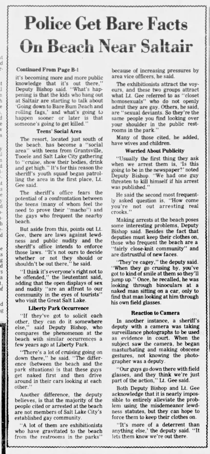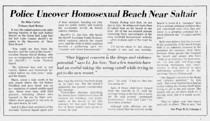 Mike Carter, “Police Uncover Homosexual Beach Near Saltair,” The Salt Lake Tribune (Salt Lake City, Utah), 6 September 1982, p. 17, 28.