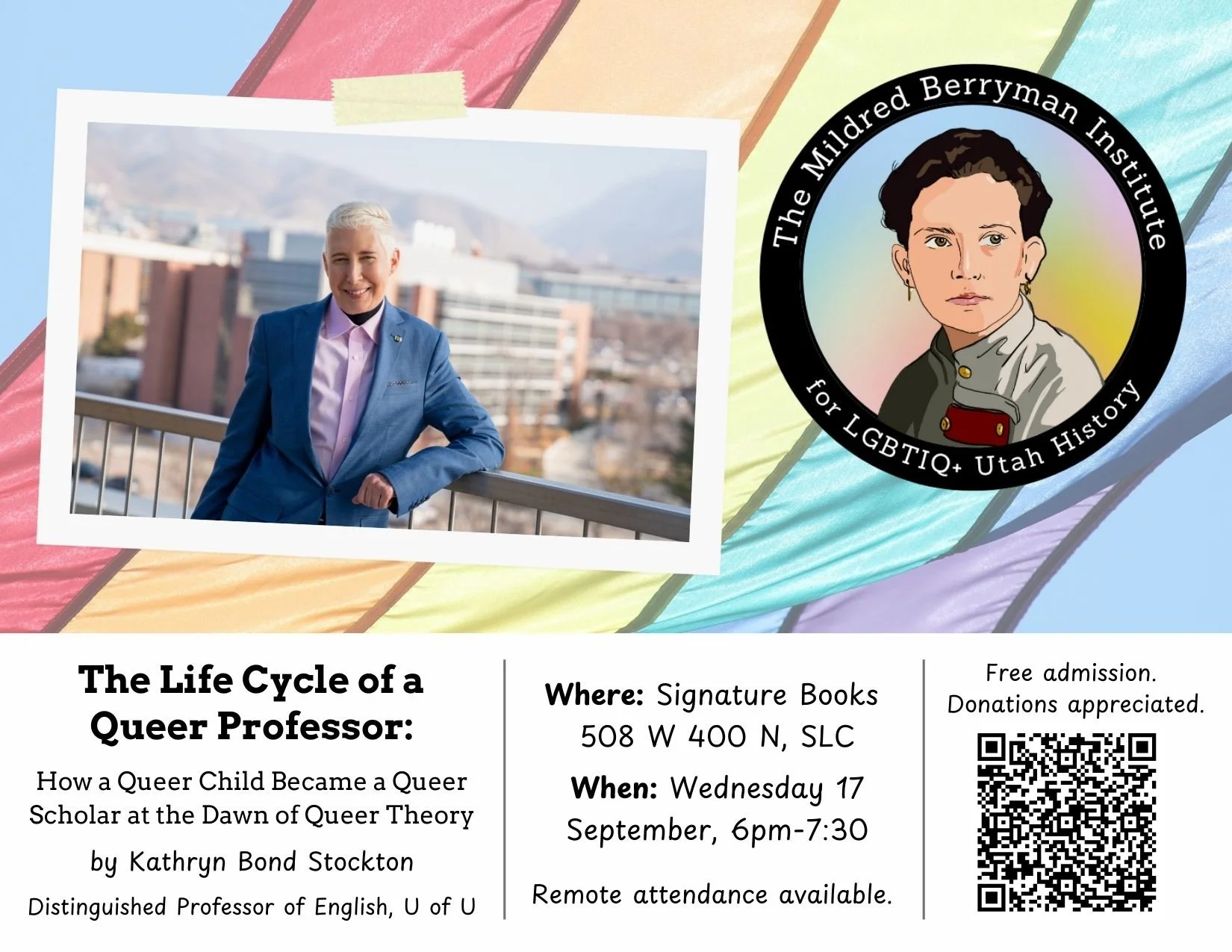 With humorous and challenging biographical stories—being a “gay” child and a “trans” child—becoming in her teens an Evangelical Christian to embrace her queerness—Stockton will tell how she came to Utah in 1987 and immediately led a curriculum revolution in the Women’s Studies Program, before becoming among the first scholars in the country to teach a course in “queer theory” (here, of all places). Prepare to learn what queer theory is; why time in divinity school laid her ground for it; why a theorist would ever consent to being a dean and a vice president; and why we might make seductive kindness the face of our very rational anger.